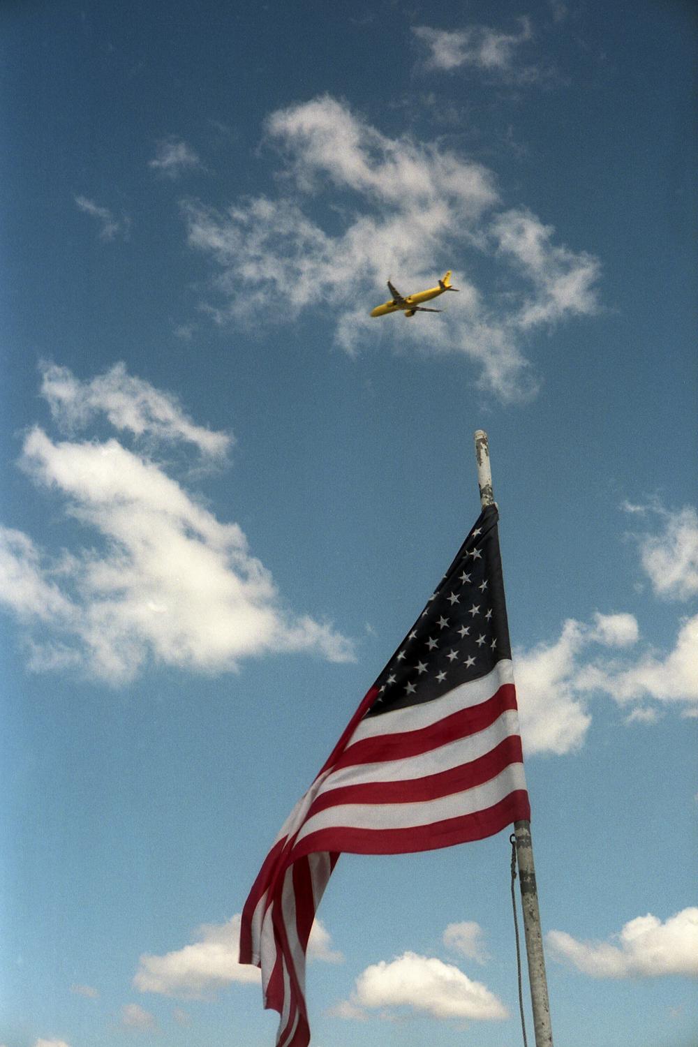 Spirit Airlines plane departing Logan Airport, flying over the American flag aboard a Boston Harbor Cruise. Taken with a Yashica Electro 35 GTN on Kodak Portra 400.