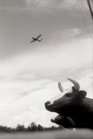 A plane coming in for a landing at Laconia Municipal Airport in Gilford, NH, USA. Photo taken from in front of Sawyer's restaurant with a Yashica Electro 35 GTN on Ilford HP5.