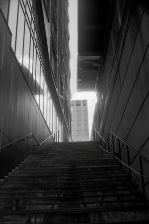 Looking up a narrow stairway in the streets of Boston, MA, USA. Taken with a Yashica Electro 35 GTN on Kodak TriX 400.